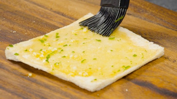 • Commencez par retirer les croûtes des tranches de pain de mie, puis aplatissez-les avec un rouleau à pâtisserie. Badigeonnez ensuite les tranches des deux côtés avec du beurre fondu, dans lequel vous aurez préalablement ajouté l'ail et le persil finement hachés.