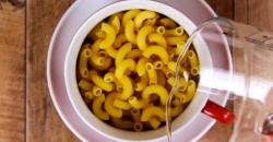 - Mettez les pâtes dans une grosse tasse et versez l'eau dedans. Faites chauffer au micro-ondes pendant 2 minutes. L'eau va cuire les pâtes, même au-dessus. De cette façon, elles seront tendres.
