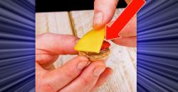 • Coupez la mangue en fines tranches que vous coupez ensuite en carrés de la même taille. Coupez les fraises et la poire en fines rondelles. Utilisez une douille ronde pour retirer les bords des rondelles de poires puis une douille ronde plus petite pour retirer le milieu de façon à faire des anneaux de poire (oignons). Mettez ces derniers dans le jus de citron pour éviter qu'ils brunissent.