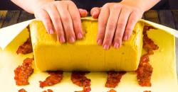 - Déroulez la pâte feuilletée sur une feuille de papier sulfurisé et déposez-y les tranches de bacon. Placez ensuite le bloc de macaronis sur la partie inférieure de la pâte et retirez le papier sulfurisé. Enroulez le bloc dans la pâte et refermez bien les bords tout autour. Mettez le tout sur une plaque allant au four.