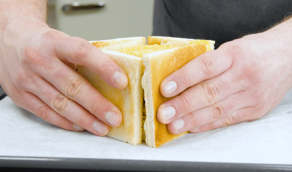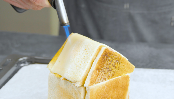 - Posez ensuite une tranche de gouda sur le toit et faites-la fondre à l'aide d'un chalumeau. Collez ensuite deux autres tranches de pain grillé de 9 x 9 cm sur les pentes du toit.
