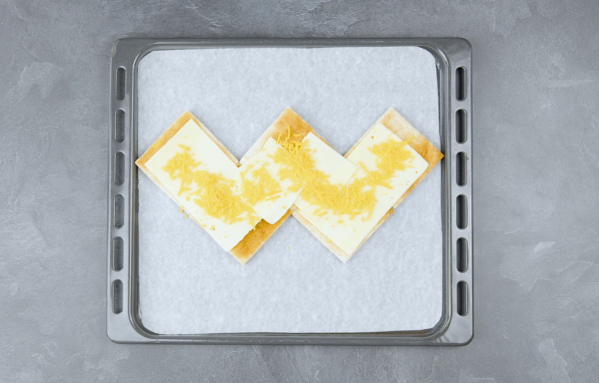 - Posez cinq tranches de pain grillé de 9 x 9 cm en forme de W sur une plaque de cuisson recouverte de papier sulfurisé. Recouvrez les tranches de pain grillé de gouda et de cheddar râpé. Enfournez ensuite la plaque à 180 °C pendant 5 minutes.