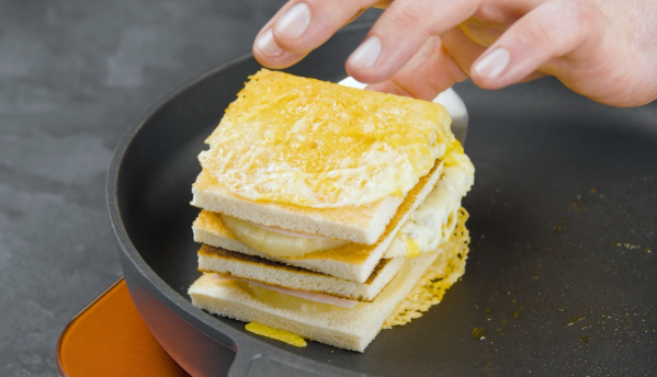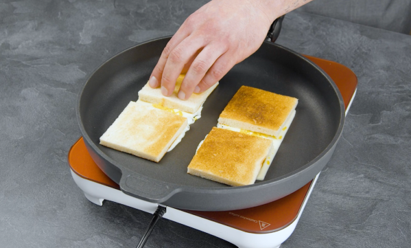 - Placez deux tranches de fromage dans une grande poêle, en les espaçant. Saupoudrez les tranches de cheddar râpé et placez deux tranches de pain de mie de 8 x 8 cm sur chaque fromage.