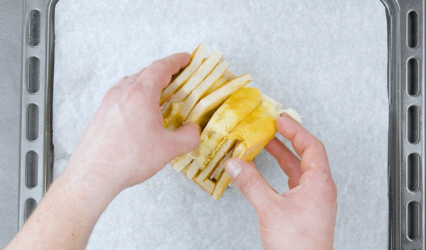 - Au centre de la forme en W sur la plaque, placez l'une des deux piles de toasts Hawaï. Soulevez les tranches de pain de mie couchées et pressez le tout. Attendez un peu que le fromage fasse office de colle pour lier les tranches entre elles.