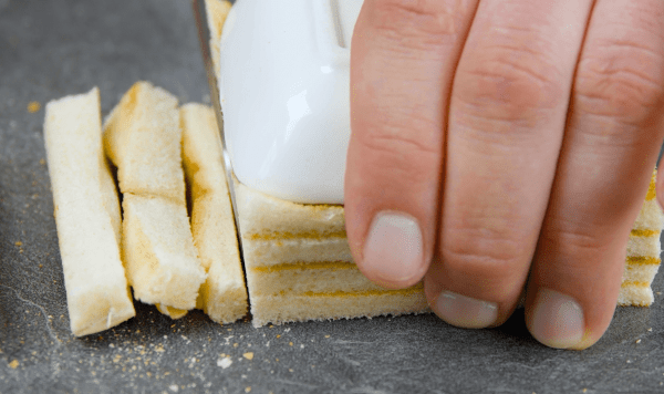 - Placez huit tranches de pain de mie les unes sur les autres et découpez-les pour qu'elles aient une dimension d'environ 8 x 8 cm. Découpez les autres à 9 x 9 cm.