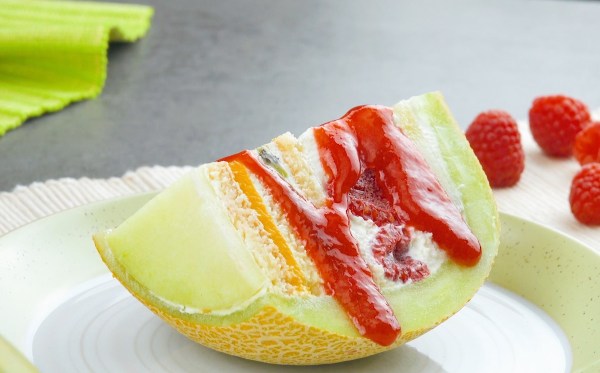 - Il est maintenant temps de remplir le melon, en suivant cet ordre : Crème, Tranches de melon, Crème, Génoise, Crème, Framboises, Crème, Génoise, Crème, Tranches de kiwi, Crème, Génoise, Crème, Tranches de mangue, Crème, Génoise, Crème, Tranches de melon. Refermez le melon rempli avec le couvercle coupé en haut au début et coupez-le maintenant verticalement.