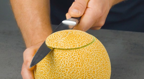 - Coupez la peau du melon au sommet pour obtenir un couvercle amovible. Retirez soigneusement la chair du melon avec une cuillère, si possible en gros morceaux, et coupez-la en tranches. Réduisez en purée le reste de la chair du fruit.