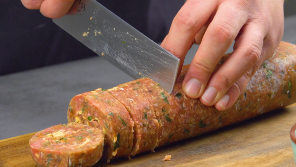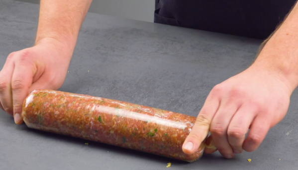 - Râpez le fromage sur la viande hachée et roulez le tout à l'aide du film alimentaire. Mettez le roulé au congélateur pendant 1 heure et demie.