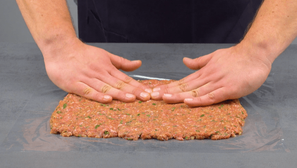 - Mettez la viande hachée, l'œuf, le persil, l'oignon, le paprika, le sel et le poivre dans un saladier et mélangez le tout. Prenez du film alimentaire et étalez la viande hachée de manière uniforme, en forme de rectangle, sur ce dernier.