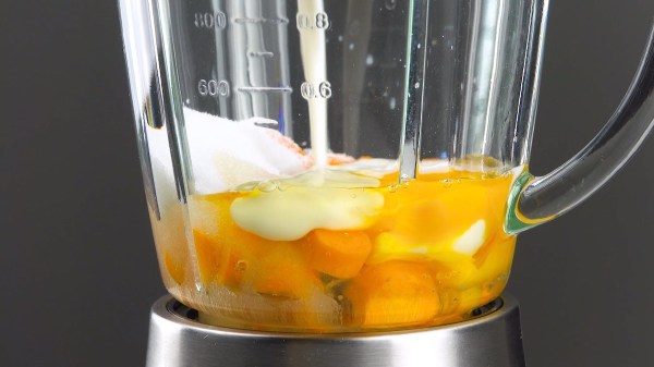 - Épluchez les carottes et coupez-les en petits morceaux. Mettez-les avec le lait, l'huile, le sucre et les deux œufs dans un mixeur et réduisez le tout en purée.