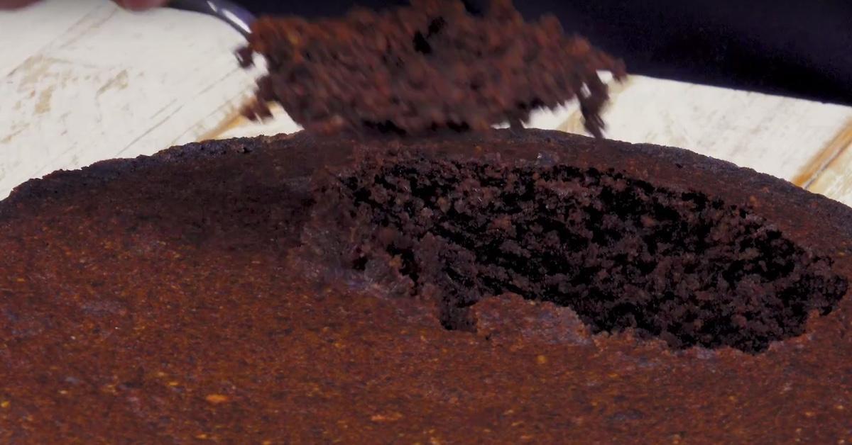 - Dès que le gâteau au chocolat est sorti du four et a refroidi, creusez dans ce dernier à l'aide d'une cuillère à soupe (n'allez pas jusqu'au fond et laissez environ 1,5 cm d'épaisseur sur les bords). Émiettez les morceaux de gâteaux retirés et laissez-les de côté pour l'instant.