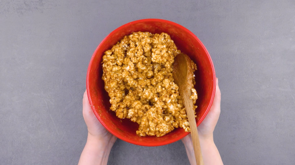 - Mettez le pop-corn dans un saladier et versez le caramel par-dessus. Mélangez pour recouvrir tout le pop-corn de caramel.