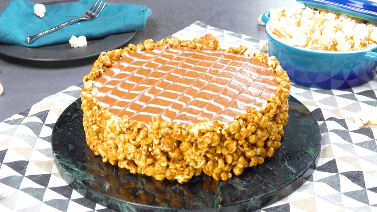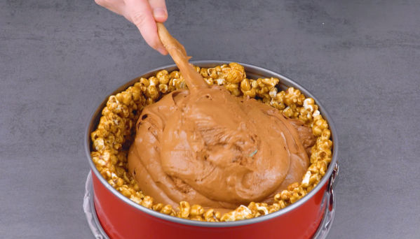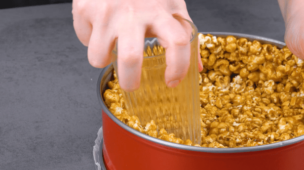 - Mettez le pop-corn au caramel dans un moule à charnière graissé et pressez-le avec un verre graissé, de manière à ce que le fond et le bord du moule en soient recouverts.