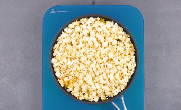 - Mettez l'huile et le maïs dans une poêle, à couvert et faites chauffer à feu moyen. Veillez à ce que les grains de maïs ne se superposent pas.
