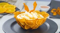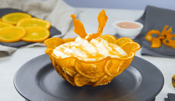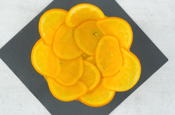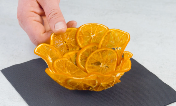 - Tapissez un bol de papier sulfurisé et placez les tranches d'orange à l'intérieur, en les superposant. Mettez un bol plus petit sur les tranches d'orange pour les alourdir. Laissez les tranches sécher au four à 100 °C (avec la porte légèrement ouverte), en mode convection pendant environ 2 heures.