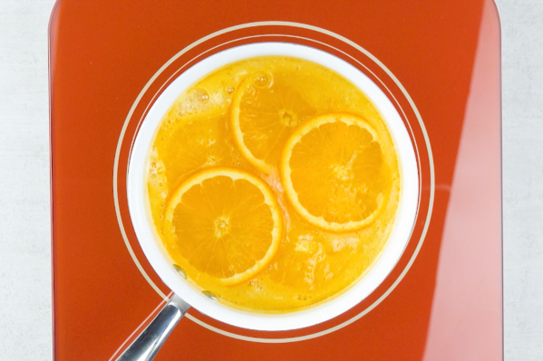 - Coupez 2 oranges en tranches d'environ 3 mm d'épaisseur. Ajoutez de l'eau, du jus d'orange et du sucre dans une casserole et faites bouillir le tout. Ajoutez brièvement les tranches d'orange dans le bouillon puis retirez-les et laissez-les s'égoutter. Mettez le jus de côté pour préparer le sirop à la fin.