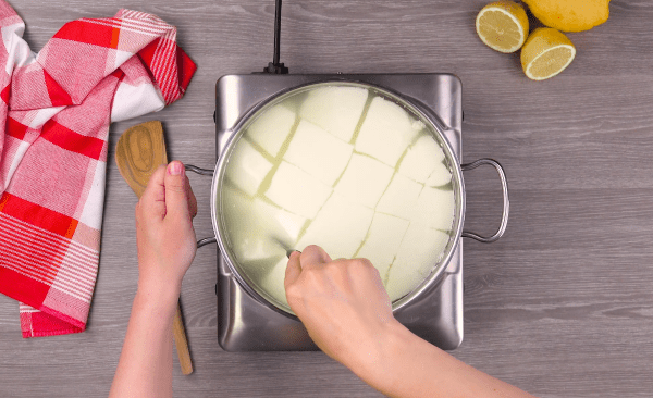 • Coupez le lait épaissi en gros cubes et attendez que le lactosérum se tasse.