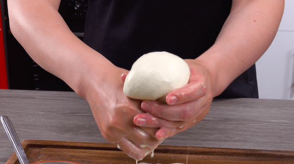 • Formez un cercle avec vos mains et placez la ricotta au centre. Couvrez ensuite la farce avec la mozzarella maison et pressez le tout pour former une boule. Laissez refroidir dans un saladier d'eau froide.