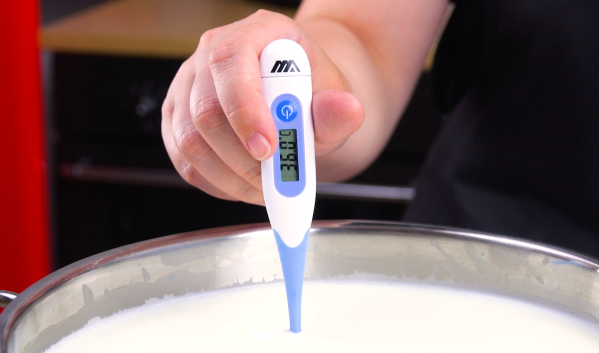 • Versez le lait dans une casserole haute. Mélangez le jus de citron avec 35 ml d'eau froide et ajoutez au lait. Chauffez le lait à 36 °C en remuant.