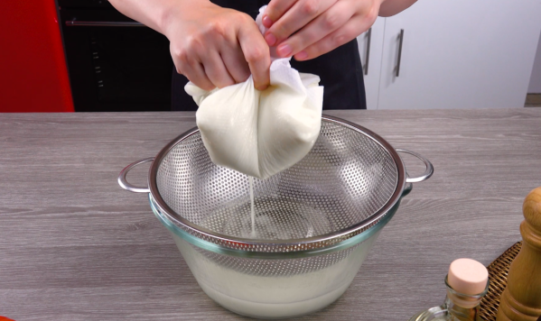 • Retirez le lait durci de la casserole à l'aide d'une écumoire. Mettez un tissu fin sur un tamis au-dessus d'un bol et versez-y le lait. Utilisez le chiffon pour presser le liquide.
