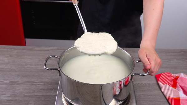 • Chauffez l'eau dans une casserole à environ 85 °C et versez-y le lait. Pétrissez la masse de fromage à l'aide d'une cuillère et sortez-la de l'eau à l'aide d'une écumoire.