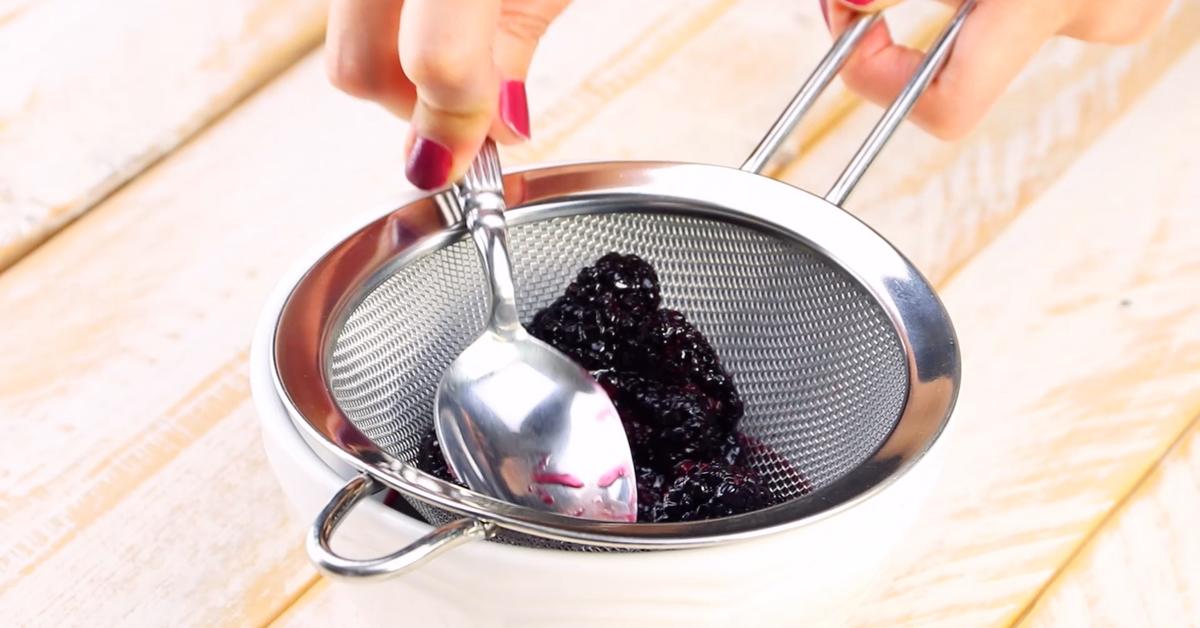 - Dans une casserole, faites cuire les mûres, le sucre et l'eau pendant 10 minutes. Utilisez ensuite un tamis pour faire couler le jus dans un bol puis écrasez les mûres pour en récupérer le jus et laissez refroidir.