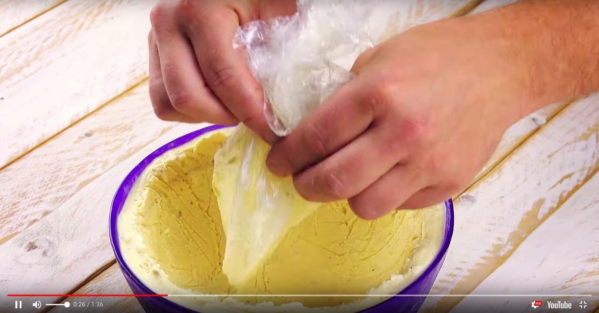 • Versez la glace à la vanille dans un grand saladier. Prenez un saladier plus petit, retournez-le et recouvrez-le de film alimentaire. Le petit saladier doit maintenant pouvoir entrer dans le grand. Enfoncez-le bien jusqu’à ce que la glace à la vanille prenne la forme du petit saladier. Placez les deux saladiers quelques instants au congélateur.