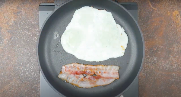 - 1.1 Placez les 2 tranches de bacon dans la poêle et faites-les frire des deux côtés. Déplacez-les ensuite au bas de la casserole. Séparez les jaunes des blancs, versez les blancs dans la moitié supérieure de la poêle et faites-les frire brièvement.1.2 Placez le bacon au milieu du blanc d'œuf, placez la brochette en bois au milieu et mettez délicatement les jaunes d'œuf sur la brochette en bois. Poivrez le tout et saupoudrez de ciboulette hachée.1.3 Faites frire la brochette de bacon et d'œuf à feu doux, repliez le blanc d'œuf vers le centre et faites frire brièvement l'autre côté de la brochette également.
