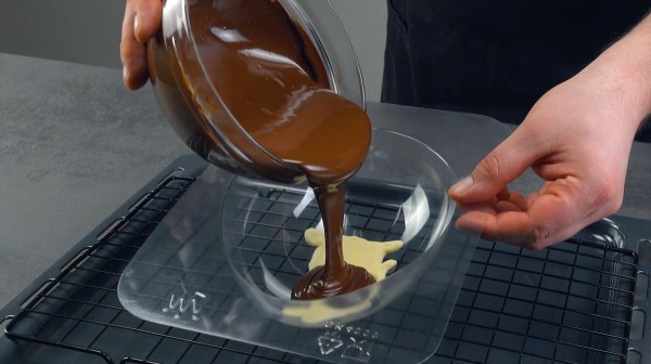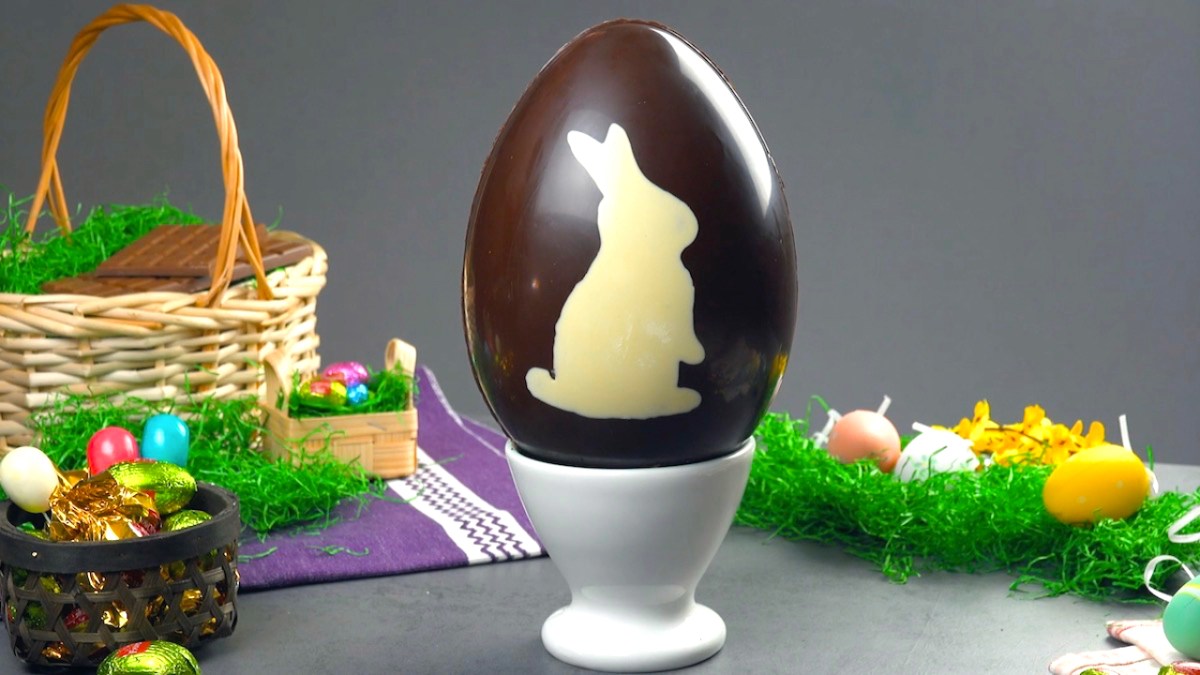 • Faites fondre le chocolat noir et versez environ la moitié de celui-ci sur le lapin blanc dans le moule. Faites pivoter le moule d'avant en arrière pour répartir uniformément le chocolat. Placez la moitié de l'œuf sur une grille avec l'ouverture vers le bas pour l'égouttage. Attendez que le chocolat ait durci, retirez-le du moule et placez-le délicatement dans un petit bol.
