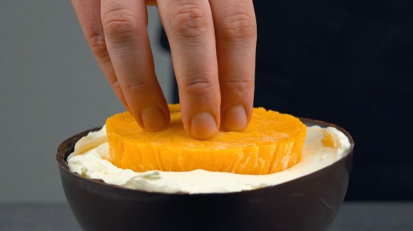 • Sortez les purées de mangue congelées de leur bol et pressez soigneusement chaque moitié au milieu d'une moitié de l'œuf. Étalez un peu de chocolat liquide sur les bords des moitiés d'œufs. Collez soigneusement les moitiés d'œufs ensemble et attendez que le chocolat durcisse.