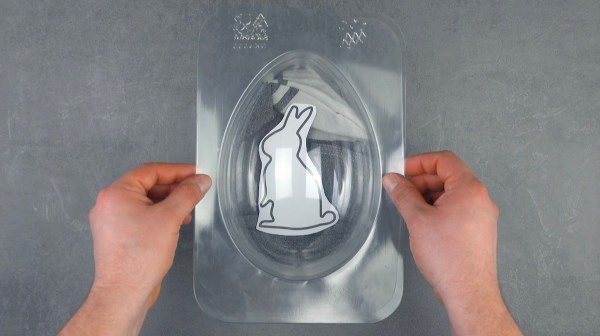 • Découpez un lapin en papier et placez-le dans une moitié du moule puis placez l'autre moitié du moule par-dessus. Faites fondre le chocolat blanc, mettez-le dans un flacon verseur et utilisez-le pour dessiner le lapin. Ensuite, laissez le lapin se solidifier à température ambiante.