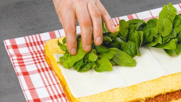 - Recouvrez maintenant la viande hachée avec la plus petite omelette ; coupez-la si nécessaire. Garnissez ensuite l'omelette supérieure de tranches de fromage et d'épinards.