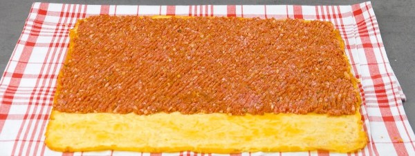 - Mélangez les ingrédients pour la viande hachée. Répartissez ensuite la viande hachée en fine couche sur la plus grande omelette, en laissant une bordure d'environ 5 cm.