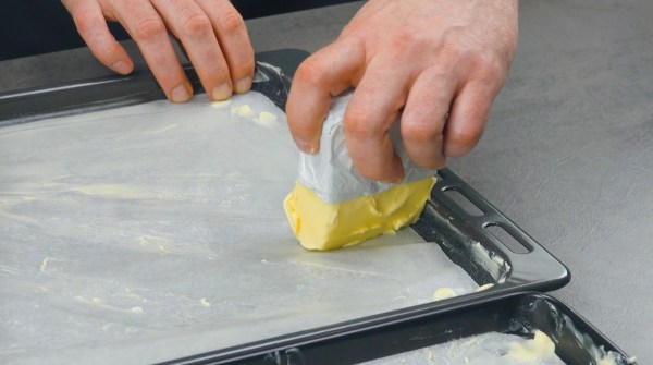 - Mélangez les œufs avec le fromage râpé et la mayonnaise. Recouvrez les deux plaques à pâtisserie de papier sulfurisé, puis graissez-les avec du beurre.