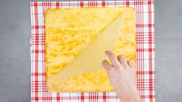 - Répartissez le mélange d'omelette sur les plaques. Enfournez les omelettes l'une après l'autre pendant 15-20 minutes à 180 °C. Après la cuisson, retournez chaque omelette sur un torchon propre, retirez le papier sulfurisé et laissez refroidir.