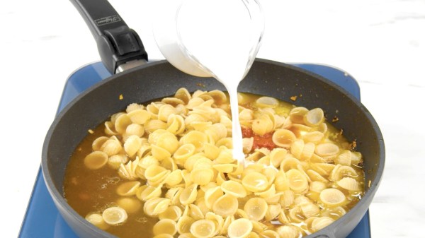 - Versez temporairement les légumes sur une plaque de cuisson. Ajoutez maintenant un peu de beurre, le concentré de tomates et les pâtes dans la poêle. Ajoutez ensuite le bouillon de légumes et le lait de coco et laissez mijoter le tout pendant environ 8 minutes à feu doux.