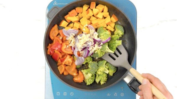 - Retirez la viande brunie de la poêle et ajoutez les légumes hachés un par un. Laissez-les colorer de tous les côtés et assaisonnez avec du sel et du poivre selon votre goût.