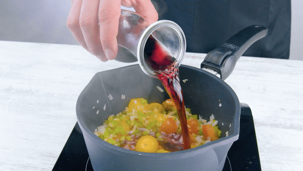 - Faites revenir les oignons, l'ail et le céleri dans un peu d'huile d'olive jusqu'à ce que tout soit un peu coloré. Ajoutez ensuite les tomates cerises et le sucre et continuez à faire revenir le tout. Déglacez avec le vin rouge, ajoutez le romarin et laissez réduire le tout. Ajoutez maintenant le coulis de tomates dans la poêle et faites mijoter le tout pendant 5 minutes.