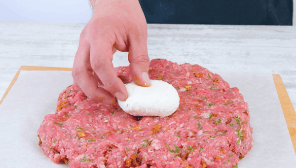 - Hachez les steaks à l'aide d'un hachoir à viande (ou utilisez directement de la viande hachée) et assaisonnez la viande hachée avec du sel, du poivre, des tomates séchées et du basilic. Ajoutez également un œuf. Répartissez la viande sur un morceau de papier sulfurisé et placez une boule de mozzarella au centre. Formez une grosse boule avec la viande autour de la mozzarella. Enfournez la boule de viande à 180 °C pendant environ 30 minutes.