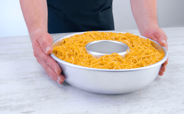 - Faites cuire les spaghettis, égouttez-les et laissez-les refroidir (en ajoutant un peu d'huile, vous éviterez que les pâtes ne collent). Mettez les spaghettis dans un saladier et ajoutez les œufs, le parmesan, la mozzarella et environ 3/4 de la sauce tomate. Mélangez bien le tout et versez la masse dans un moule à savarin. Appuyez un peu sur la masse et mettez le moule au four préchauffé à 180 °C pendant 30 minutes.