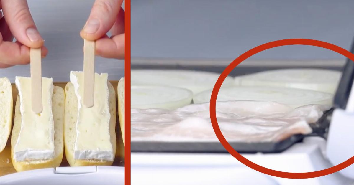 - 3.1) Enfin, transformez l'appareil à croques-monsieur en poêle : coupez l'oignon en tranches et faites-le cuire jusqu'à ce qu'il devienne croustillant. Faites de même avec le bacon, tout cela en laissant l'appareil ouvert.3.2) Pendant ce temps, coupez deux pains au lait en deux et placez une épaisse tranche de camembert sur deux moitiés. Placez par-dessus un bâtonnet de crème glacée.3.3) Maintenant, étalez les rondelles d'oignon et le bacon sur le camembert, fermez les petits pains et faites-les cuire.