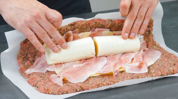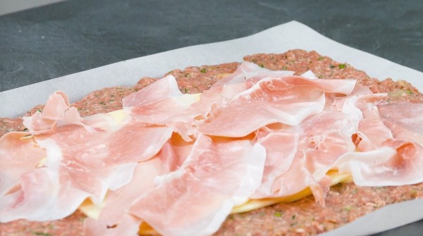 - Mélangez les ingrédients pour la viande hachée. Étalez la viande hachée de façon homogène sur un grand morceau de papier sulfurisé et recouvrez-la des tranches de fromage puis des tranches de jambon.