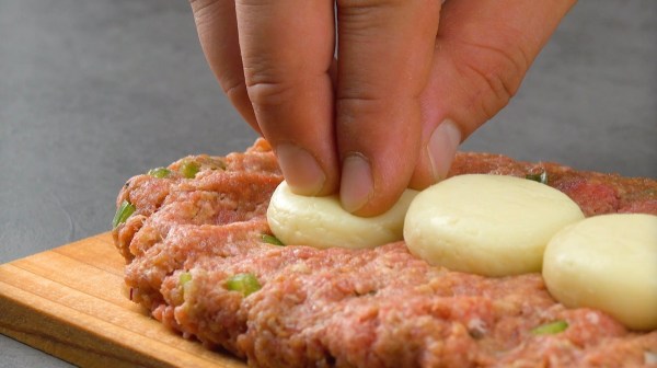 - Étalez la moitié du mélange de viande sur la planche et posez-y les Babybel au milieu dans le sens de la longueur. Couvrez avec la deuxième moitié du mélange de viande et pressez les côtés de la viande ensemble afin que les Babybel soient entièrement enfouis à l'intérieur.
