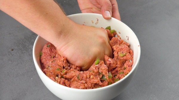 - Mélangez la viande hachée avec un peu de mélange d'épices, de la chapelure, du lait, de la sauce Worcestershire et un œuf, ainsi que des dés de poivron vert, d'oignon et d'ail.