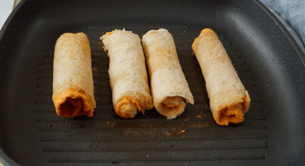 - Déposez le morceau de cheddar dans la poêle chaude et laissez-le fondre pendant environ 1 minute. Retirez ensuite le cheddar de la poêle et enfoncez une tranche de pain de mie dans la masse de fromage fondue qui est restée dans la poêle.Aplatissez la tranche de pain de mie à l'aide d'une spatule, puis roulez-la pour former un petit rouleau. (Attention : le toast au fromage est très chaud.) Répétez l'opération avec le morceau de cheddar restant et les trois autres tranches de pain de mie.Faites dorer les pains perdus roulés de tous les côtés et laissez-les refroidir pendant environ 5 minutes.Servez les rouleaux de pain perdu avec le pain de mie fourré de camembert fondu. Le fromage fondu est idéal pour tremper les rouleaux.