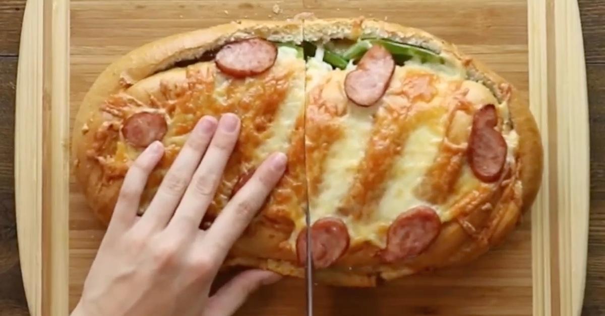 - Recouvrez l’intérieur du pain de sauce pizza. Étalez des tranches de mozzarella, puis recouvrez le tout avec du chorizo et enfin des morceaux d’oignon. Ajoutez le basilic puis de la saucisse de Strasbourg coupée en dés. Ajoutez ensuite le poivron coupé en bandes puis le Cheddar.