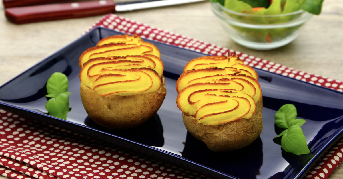 - Pour finir, déposez votre garniture dans les pommes de terre vidées. Pour parfaire le tout, pressez la purée contenue dans la poche à douille par-dessus les pommes de terre maintenant remplies. Il ne vous reste plus qu’à enfourner pendant 20 minutes au four.