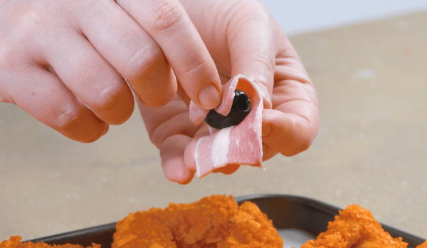 • Enroulez quatre olives noires dans des demi-tranches de bacon et six olives noires dans des poivrons rouges. Placez deux des olives de poivron dans une petite rondelle d'oignon.