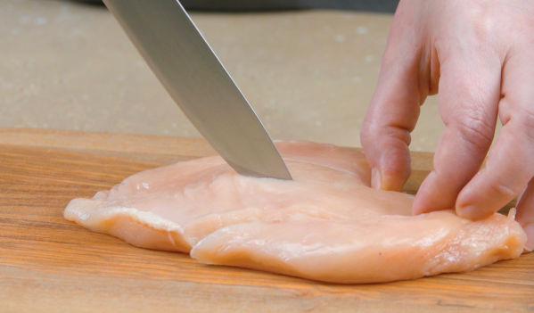 • Aplatissez les 3 poitrines de poulet et incisez-les trois fois dans le sens de la longueur, juste avant l'extrémité, de manière à obtenir quatre longs "bras" au total.