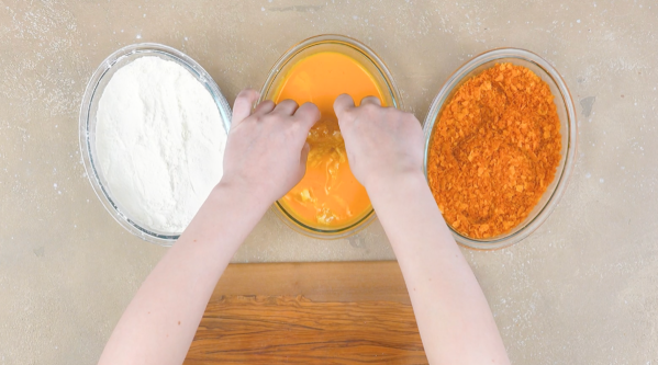 • Roulez la viande d'abord dans la farine, puis dans l'œuf et enfin dans des chips de paprika émiettées.